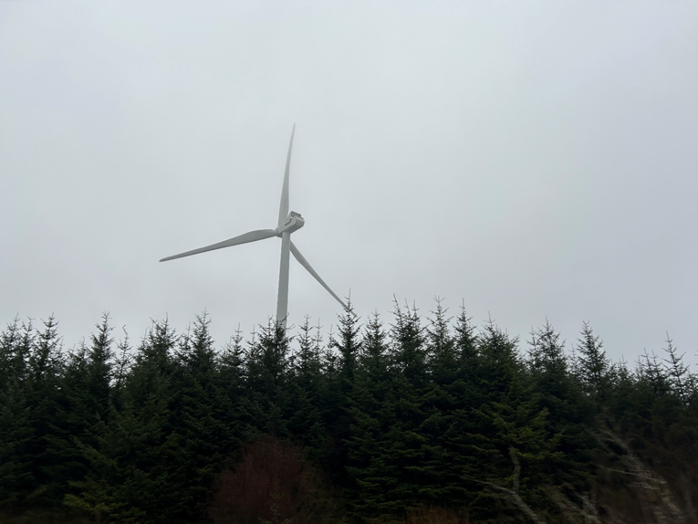 Before I had even arrived at our meeting point within the forest, I was struck by the sights of the site. All of a sudden, whilst I drove across the hills near Cerrigydrudion and Llanfihangel Glyn Myfyr, there appeared giant dancers of shining white amidst the trees. What a sight! Though I’d seen many wind turbines in the distance from my childhood home in Montgomeryshire and have learned about Trydan’s mission and plans over the last few months, nothing compared to seeing such marvels of engineering up close and in-person.