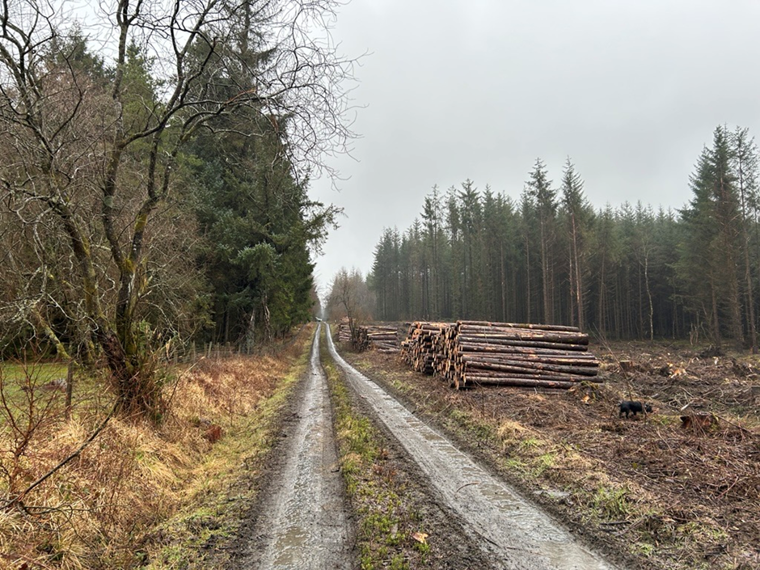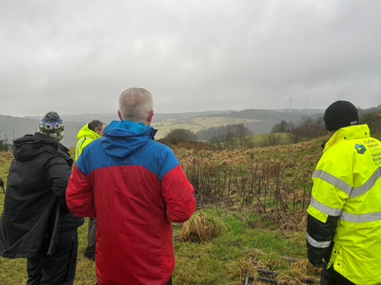 I was welcomed warmly at our meeting place by Adam (and his loyal dog, Pepper), as well as Ffion, Clocaenog Dau’s NRW Project Manager, and Danny and Rob, NRW civil engineering advisors specialising in forestry. The team’s specialism and experience really benefitted my visit, as someone who, though passionate about the environment and the future of Wales’s communities, is a relative newcomer to the world of work and the thought processes behind large energy projects.